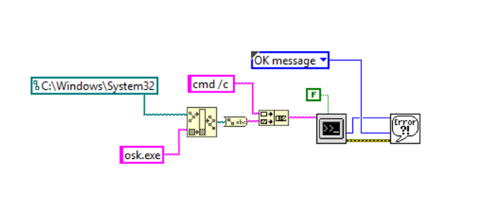 이를 이용하여 랩뷰에서도 커맨드 실행 함수를 이용하여 OSK 라고 입력하면 키보드가 나타난다.
