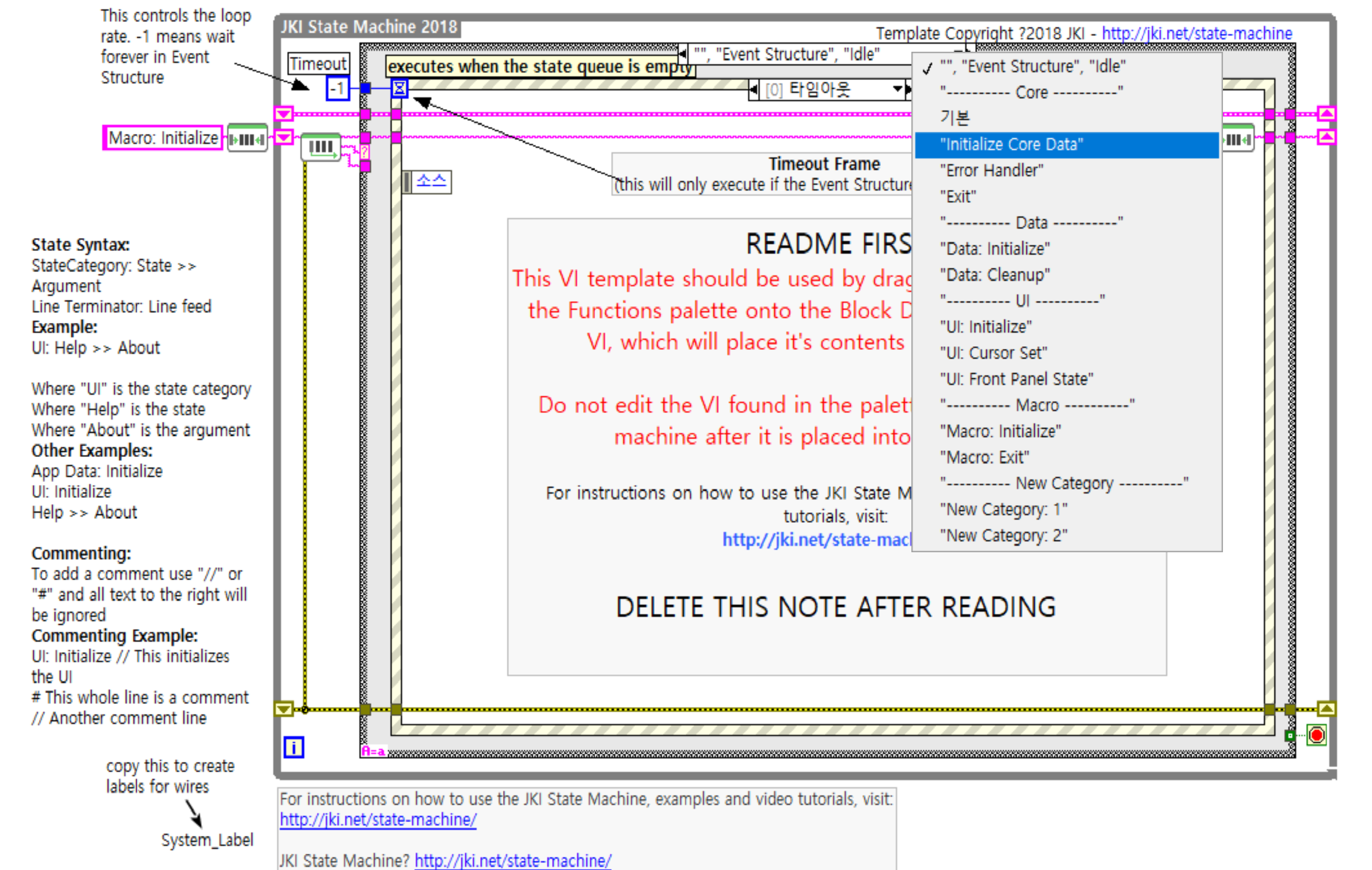 아래 그림이 JKI State Machine 을 블록 다이어그램에 올려놓았을 때, 기본 프레임이다.